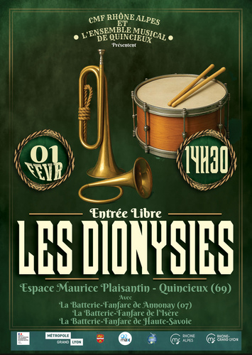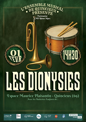 La CMF Rhône-Alpes, en partenariat avec l’Ensemble Musical de Quincieux (69), organise une rencontre simple et festive de Batteries-Fanfares. Cette rencontre aux allures de qualité et de convivialité se concrétisera par la première édition du Festival Les Dionysies.